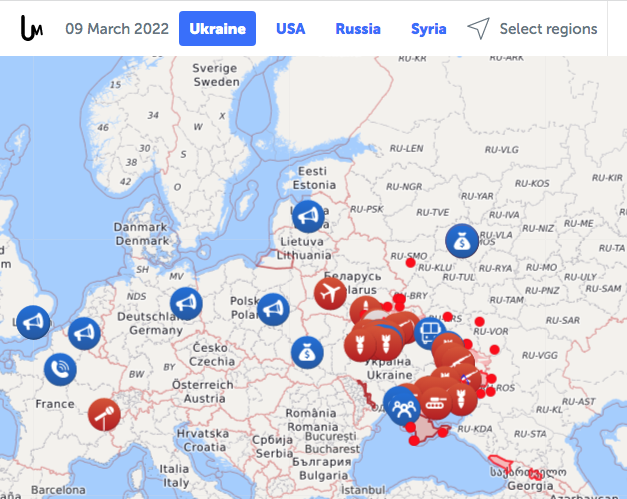 アイコンをクリックすると、どの地点でどんなニュース/口コミがあったかが表示される。ただ、このニュース/口コミについては、一般からの書き込みではなく、クローラとAIを使ってweb上の情報を集め、それを人間のエディタが見てから載せているらしい。そもそも2014年にウクライナの紛争?を世界に知らしめるためにつくられたというから、現地には浸透しているのかもしれない。